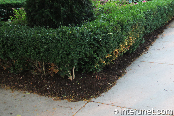 Nicely done landscaping work with creation of a simple garden hedge fence. Buxus sempervirence is commonly used plant in landscaping. It is requiring frequently care and making a shape of live hedge should be done a few times a year. For homeowners who like garden work hedge is a perfect choice for fence.